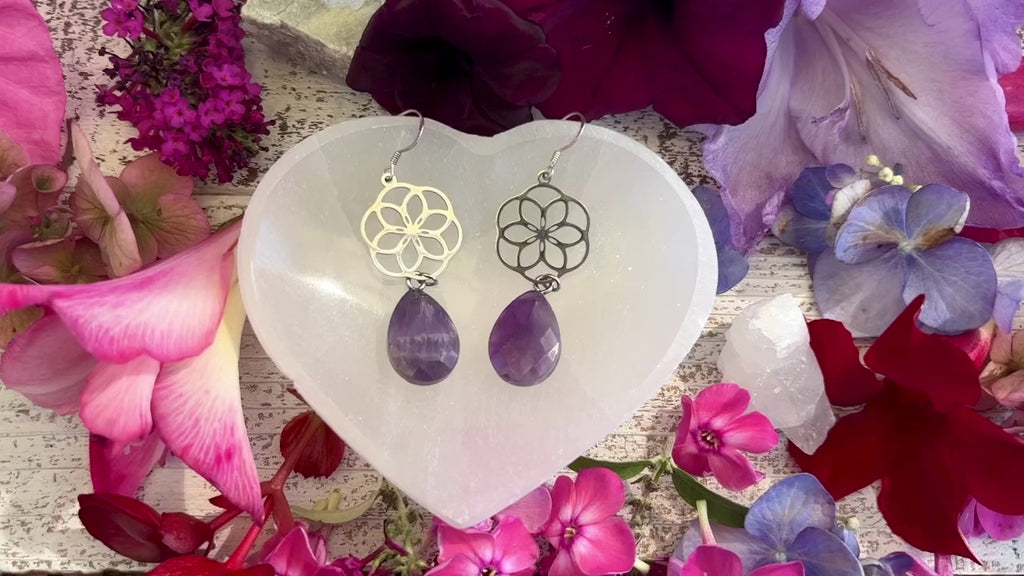 Beautiful flowers(stainless steel) with incredible Chevron Amethyst drops on sterling silver backs.