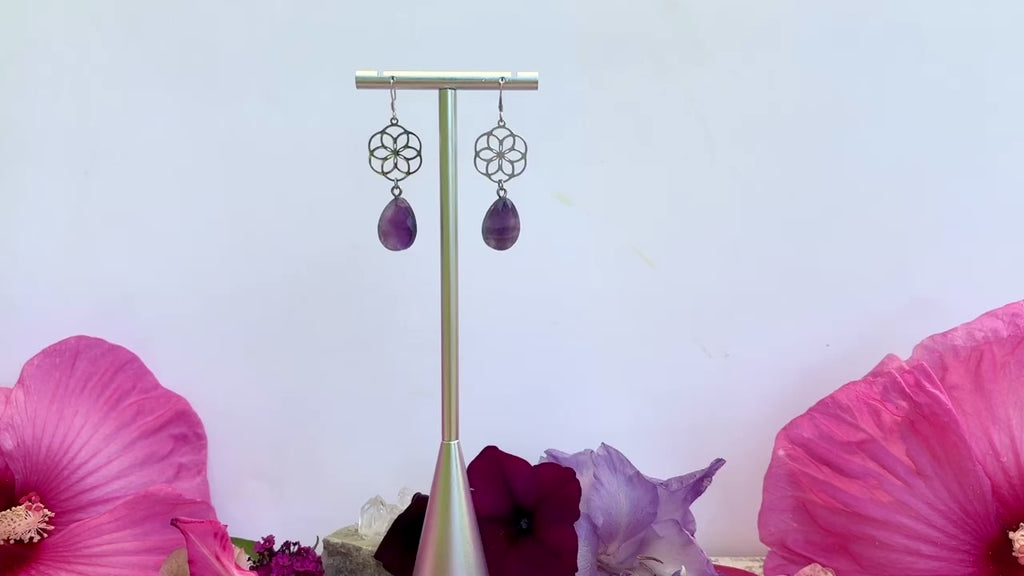 Flower Earrings with Chevron Amethyst Teardrops on Sterling Silver Backs