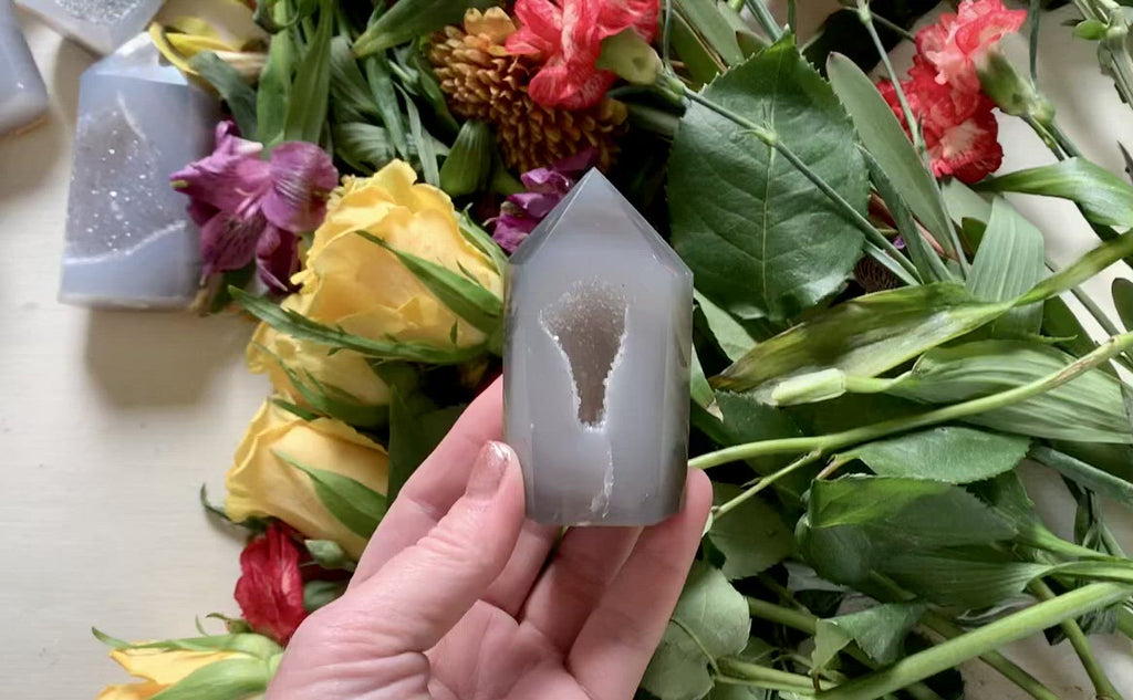 Step 1: Cleanse your Agate Tower with Druzy Window in warm water or smudge smoke. Step 2: Agates loves charging in the moonlight or on a quartz cluster or in a Selenite bowel.