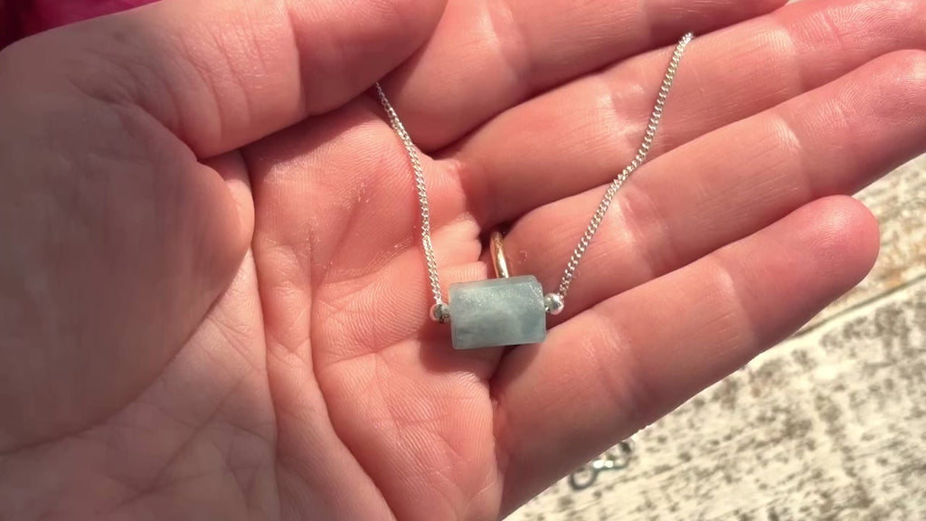 Translucent Aqua Marine free from from Morocco dances on this 16" fine sterling silver chain with sterling silver accent beads.