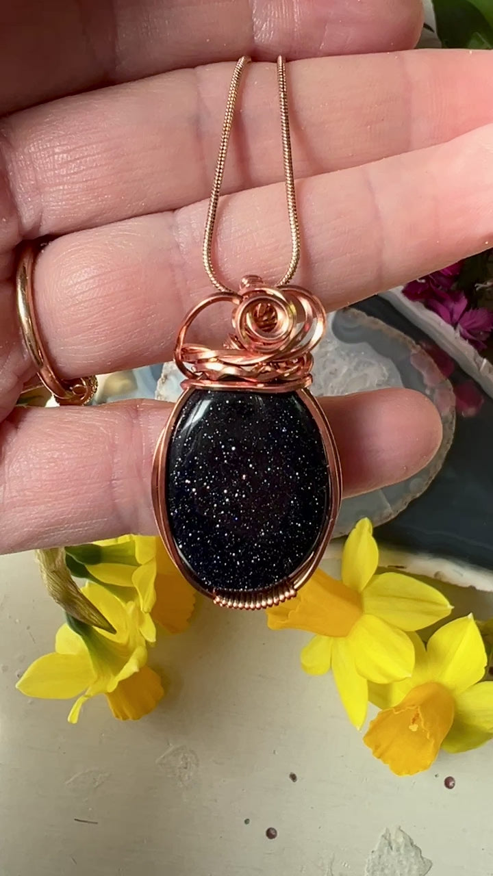 Blue Sunstone Wrapped in Copper Hanging from Rose Gold Chain