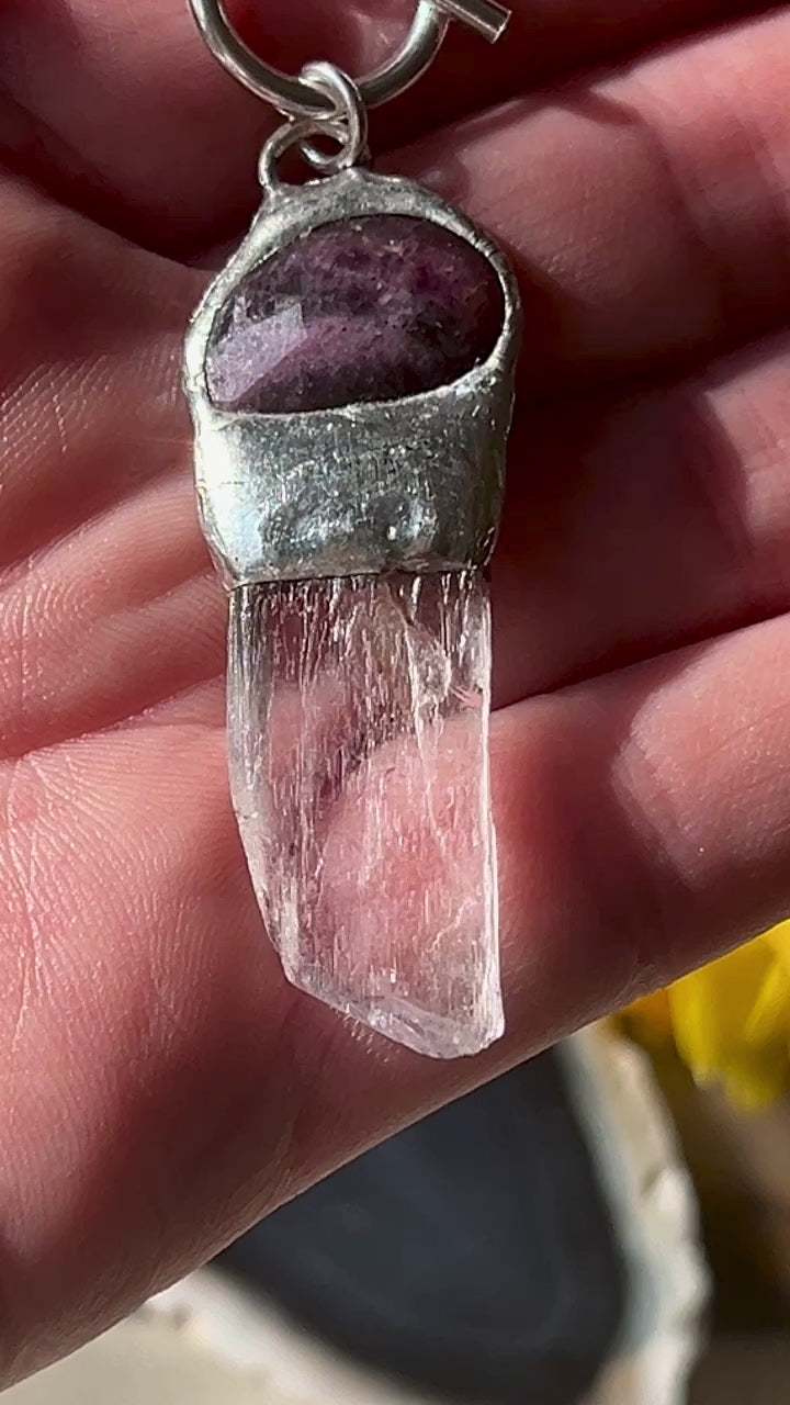 Incredibly clear pink Kunzite from California is soldered to a gorgeous reddish pink sapphire from Madagascar and hangs from sterling silver toggle and hand made chain.