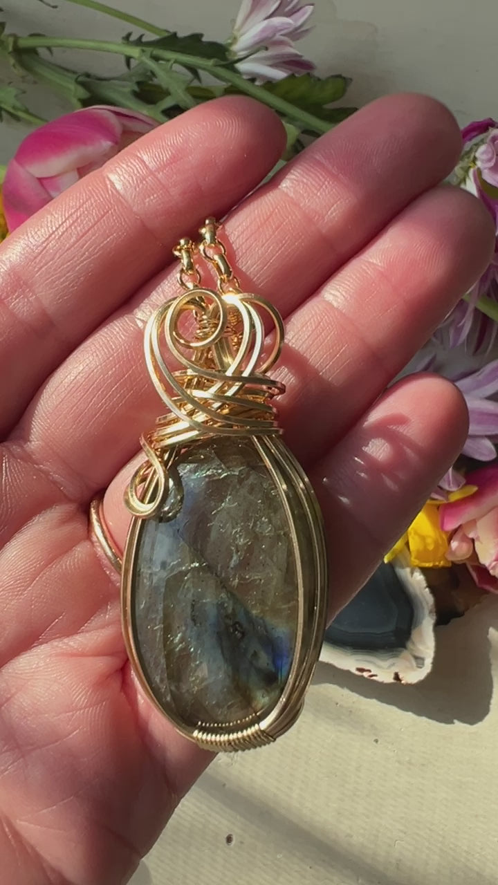 Spectacular large labradorite flashes with blue, green and purple and wrapped in 14KG hanging from beautiful gold chain.