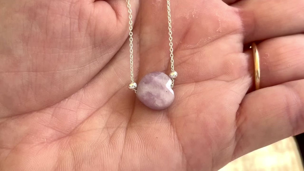 Calming Lepidolite heart floats on a fine 16" sterling silver chain with sterling silver accent beads.