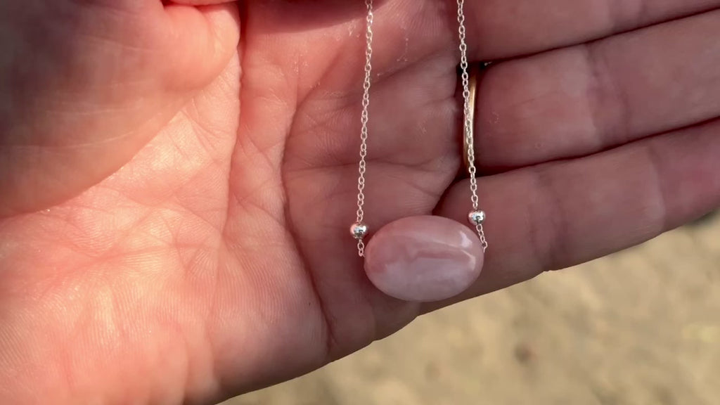 Calming natural Pink Opal floats next to sterling silver accent beads on a fine 16" sterling silver chain.