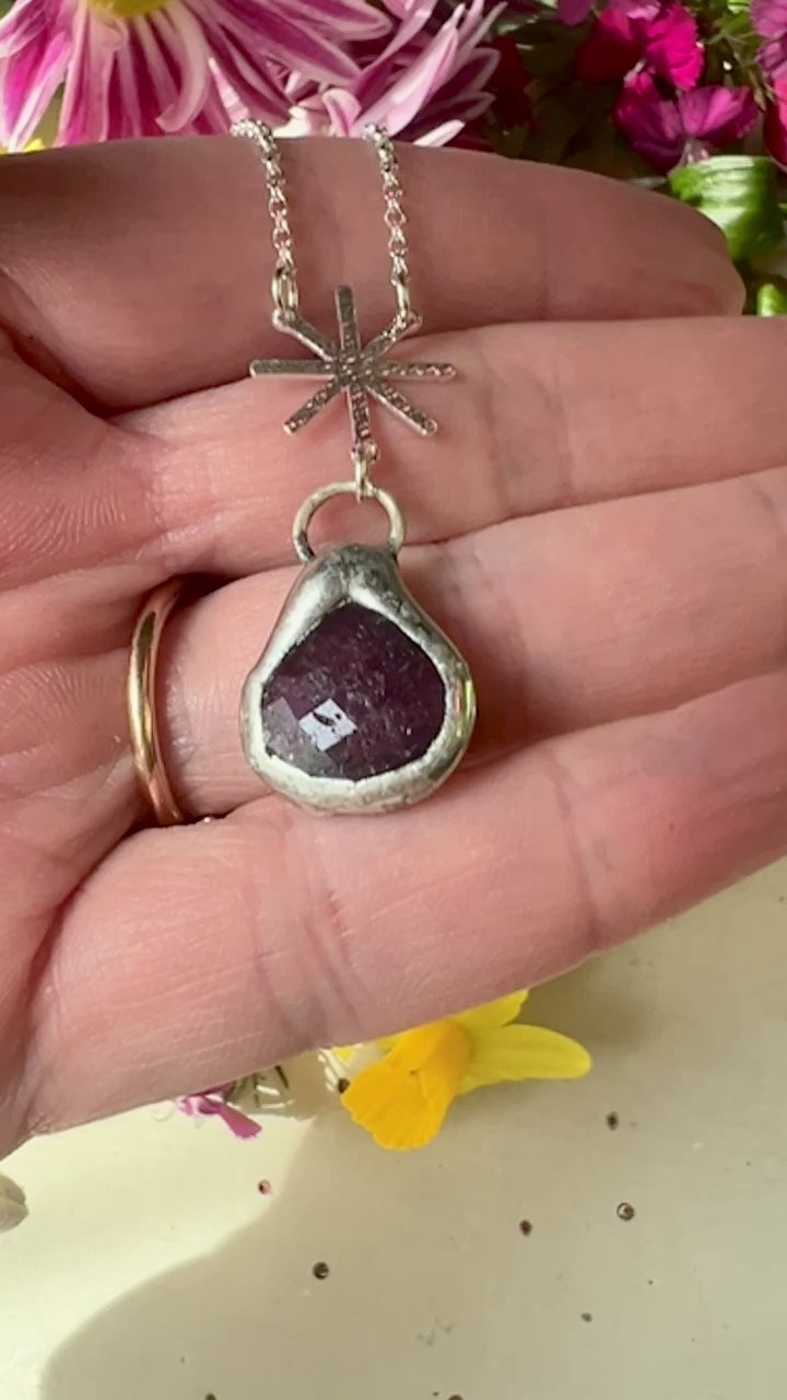 Incredible pink sapphire from Madagascar is soldered and hangs from a delicate vintage sterling star and hand made sterling chain.