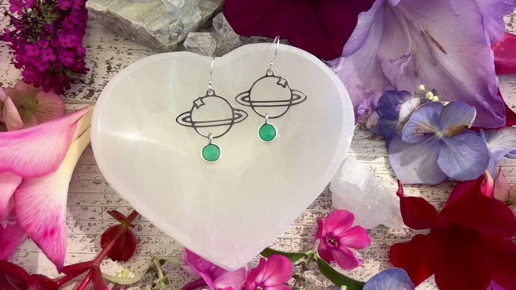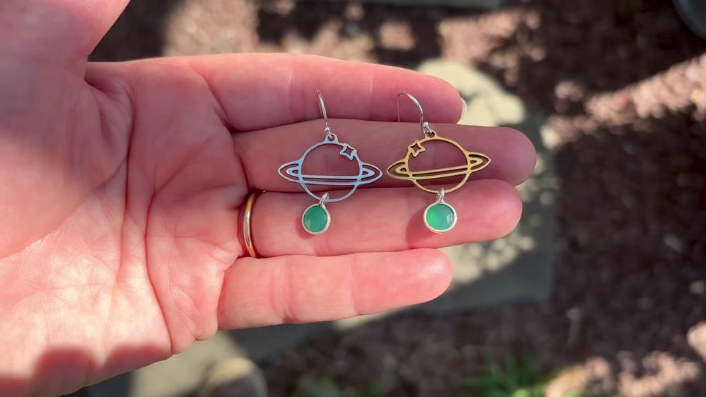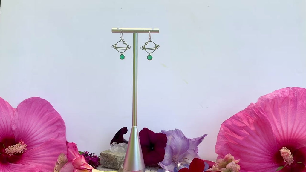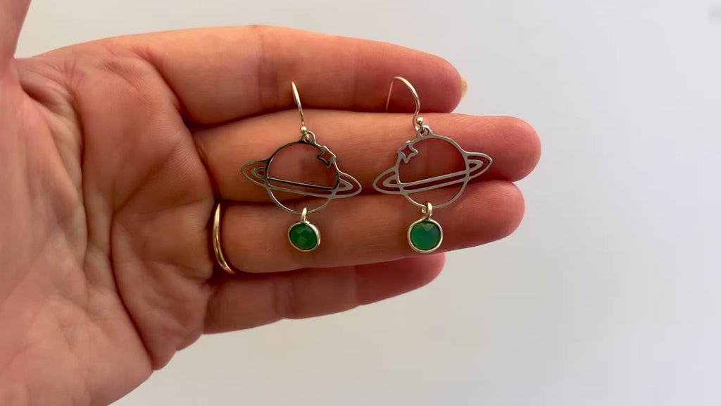 Whimsical planet earrings (stainless steel) with delicate sterling silver emeralds on sterling silver backs.