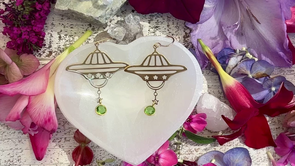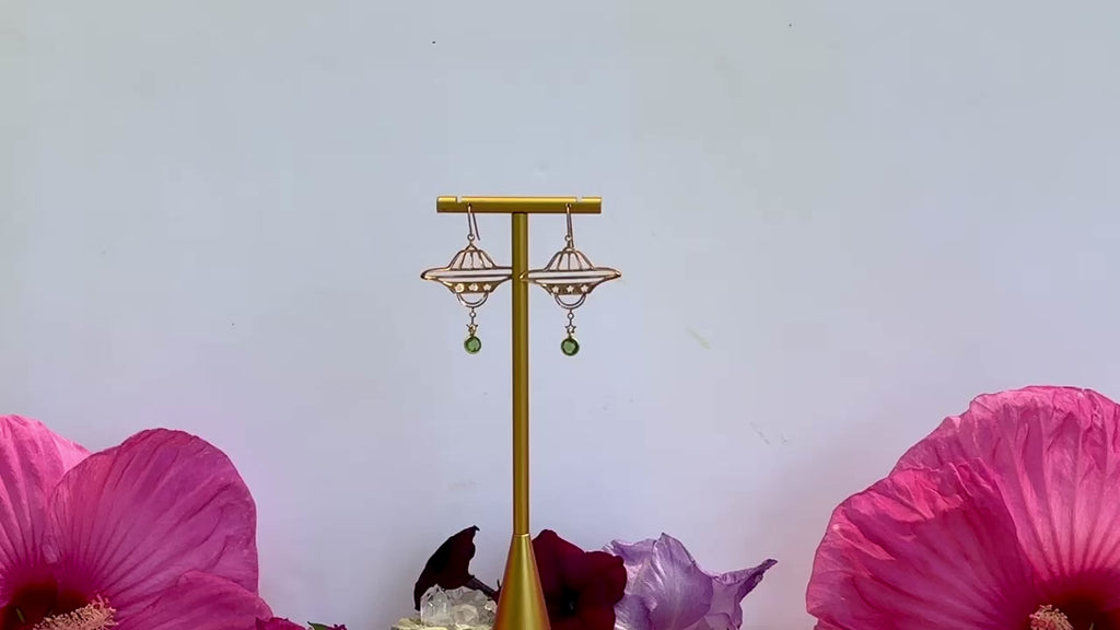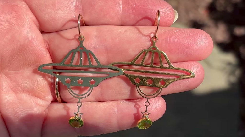 Whimsical planet earrings (stainless steel) with gorgeous Peridot on 14KG backs.