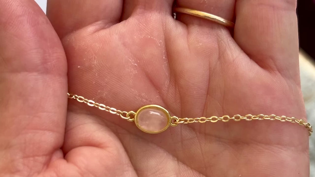 Tiny oval luminescent Rose Quartz hangs delicately on 16" 14GF fine link chain. Perfect for layering with other pieces.