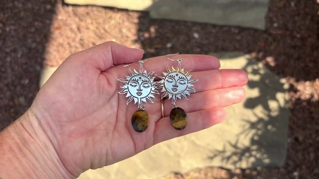 Golden faceted Tigers Eye drops from a glorious stainless steel sun and sterling silver backs.